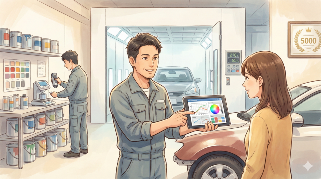 当店の分光測色計は、損傷のないパネルの色を精密に測定し、その結果をデータベースに数値管理し、貴重な「データ資産」として蓄積しています。