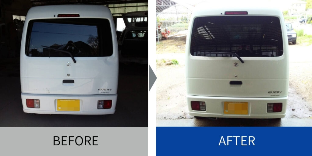 エブリイのリアバンパーとバックドアの大きなへこみを、鈑金塗装で対応。