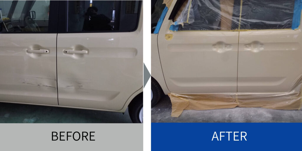 スペーシア左前後ドアの大きなへこみを鈑金修理で対応。前後パネルをぼかさず塗装し、調色と磨きを徹底。