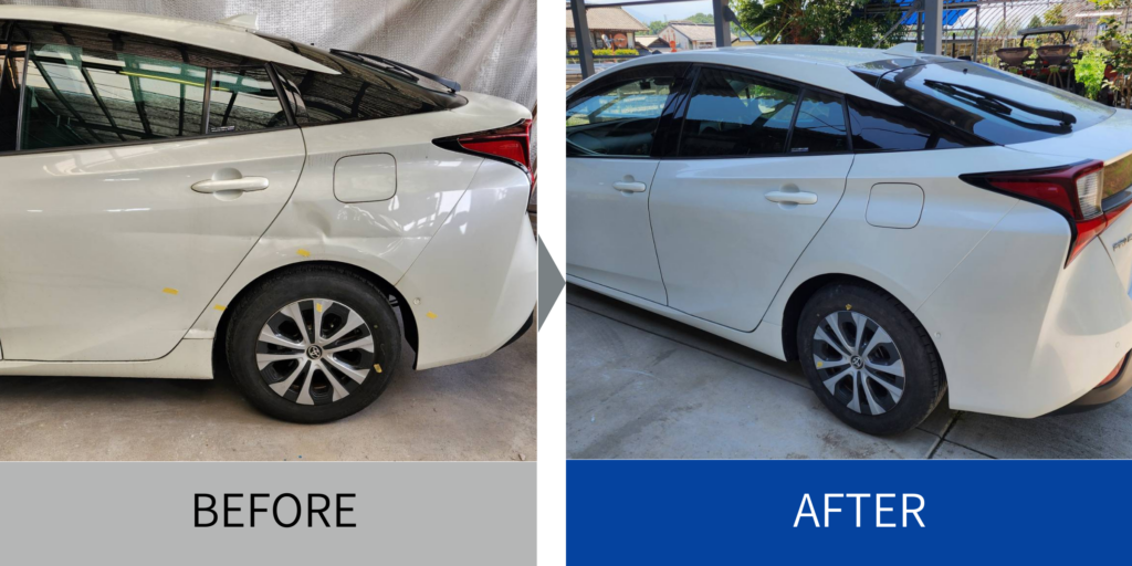 深いえぐれやプレスラインも丁寧に復元し、3コートパールをムラなく塗装。新品交換を避け、仕上がりと費用の両立を実現しました。